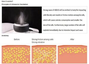 Močna zvočna vala s maščobne glave s skupinsko močno zvočno valovno glavo, v človeško telo odda močan zvočni val 40000 Hz, ki močno vpliva na maščobne celice in povzroči gibanje trenja med maščobnimi celicami. To lahko povzroči učinkovito porabo kalorij in vlage v maščobnih celicah in zmanjša velikost maščobnih celic. Še več, vibracije zvočnega valovanja lahko povzročijo močan vpliv maščobnih celic, da jih takoj eksplodirajo, zmanjšajo količino maščobnih celic in s tem dosežejo učinke odstranjevanja maščobe.